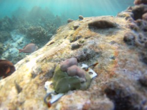 The next day (yesterday), we deployed the video cameras again, only this time to capture a different experiment. In this experiment, we are looking at the effects of sedimentation and vermetid snails on coral growth. Sedimentation is a big problem for coral reefs around the world, because sediment can smother corals, and increased coastal development tends to lead to increased runoff and sedimentation of nearshore marine ecosystems (like coral reefs, seagrass meadows, and kelp forests). We also know that vermetid snails that use mucus nets to feed can also be quite detrimental to corals (see previous posts for more info). So, we wanted to see how these two stressors together may affect corals—for example, maybe sediment is actually pulled off of the coral by the vermetid mucus net, or, alternatively, maybe the mucus net, being sticky as it is, allows sediment to better adhere to the coral surface, causing more damage. These are the hypotheses we are testing, and to help us understand what exactly is going on, we have been shooting photos of each coral at 10-second intervals throughout the day. Yesterday was one of these days, so we again left our GoPro cameras out in the field for several hours. Upon our return to retrieve the cameras just before dusk, my assistant Julie noticed that one of the cameras was missing from the 5 lb dive weight to which we’d had it cable tied. The cable tie was mangled. She also noticed a very large octopus atop the reef next to where the camera was. When she called me over, I approached the octopus. Yes…he stole our GoPro: