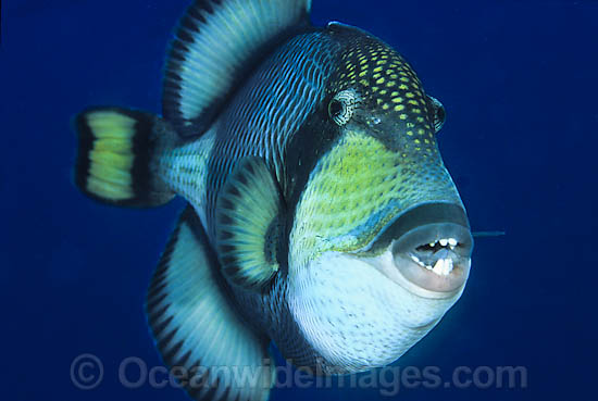 Stock photo of a Titan triggerfish with his/her gnarly teeth showing. These things can BITE!