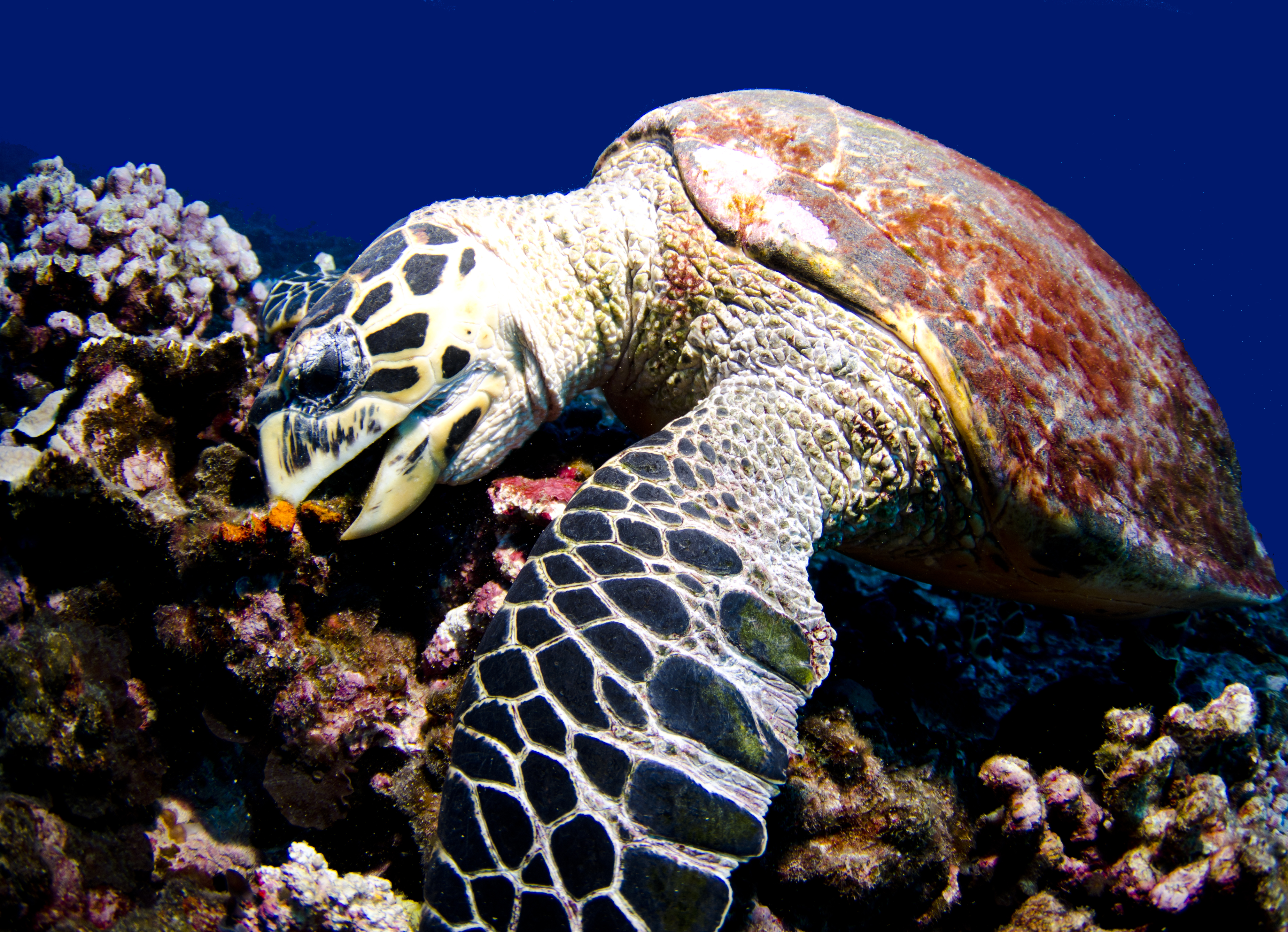 A camera-friendly hawksbill sea turtle scarfs down algea and coralomorphs as a frantically try to get a quality close up.