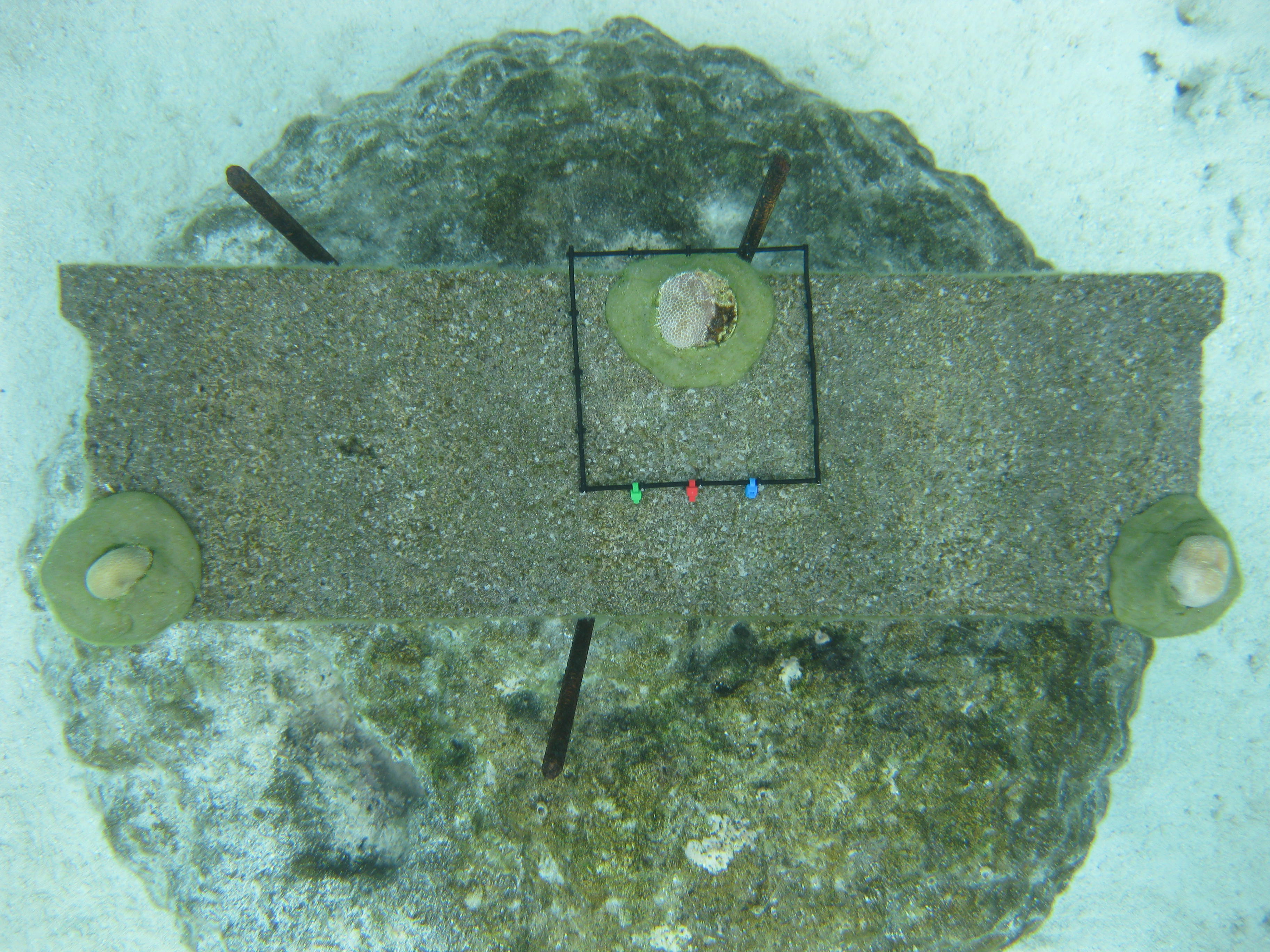 This is a shot from above of one of my study plots, which I will monitor for the next year to evaluate changes in coral and algae cover. The little knobs are juvenile corals that I epoxied to the cinder block. The three poles are rebar, drilled into the dead coral below to ensure the cinder block is not swept away by a storm in the coming year. The black square is a ‘photo quadrat’ used to keep the scale and perspective uniform among subsequent photos of the same unit, and the color bar allows us to use color-correction software to keep colors uniform.