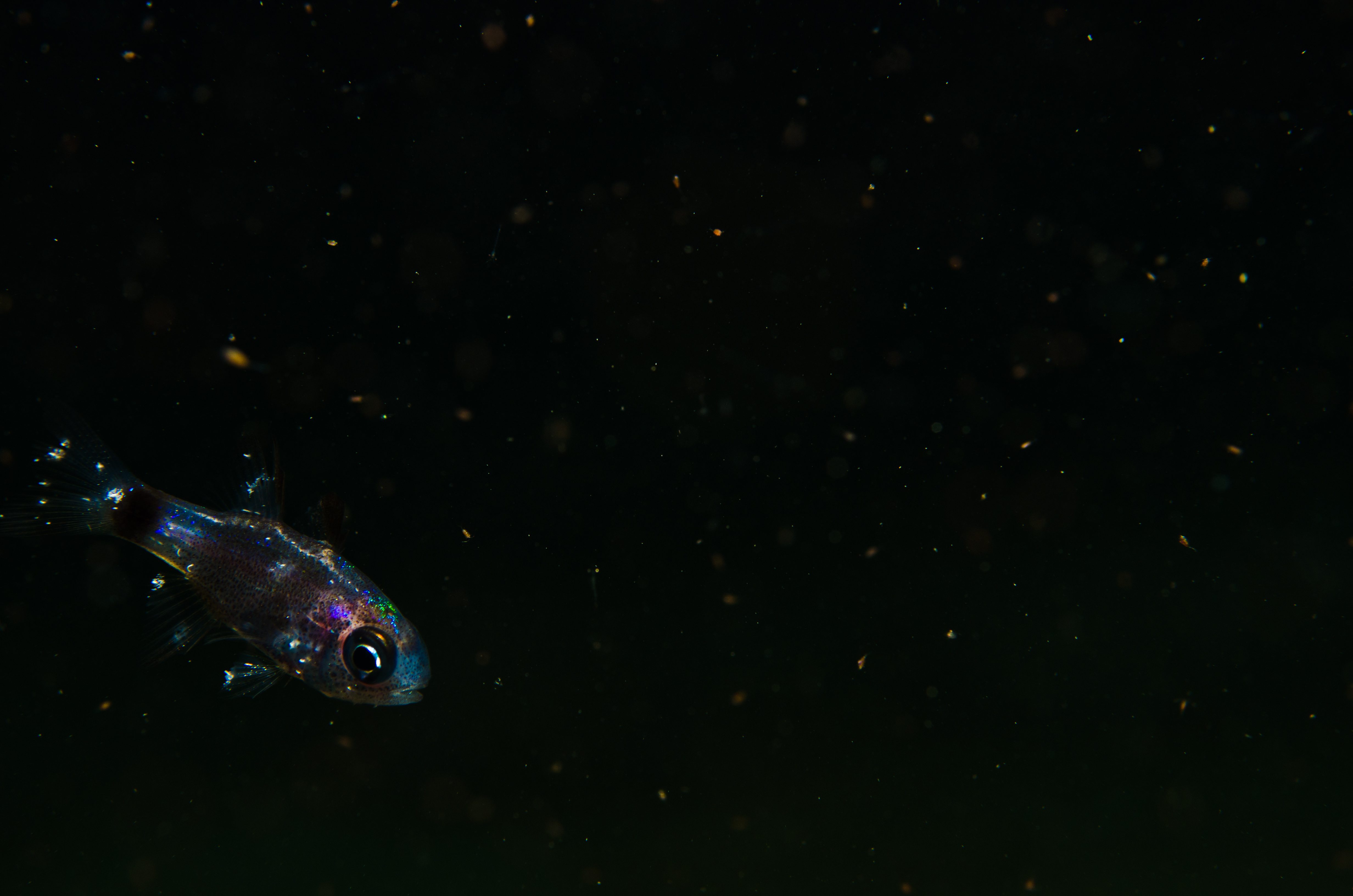 A baby (barely post-larval) cardinal fish was attracted to my spotlight, making for a nice and unexpected photo op