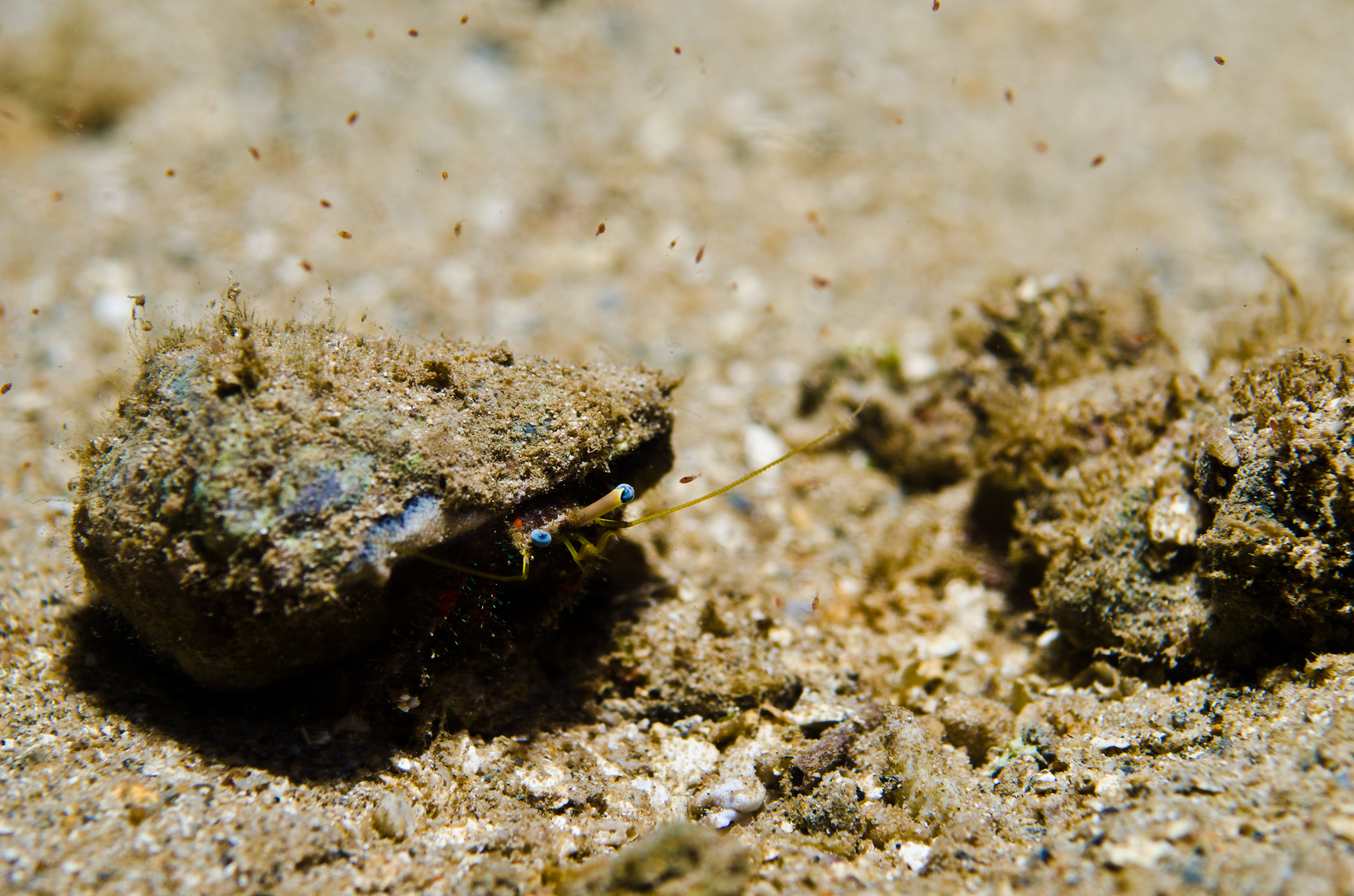 A hermit crab is out foraging, while zooplankton (copepods, which look like suspended sediment above the crab in the photo) dart around, entranced by my spotlight