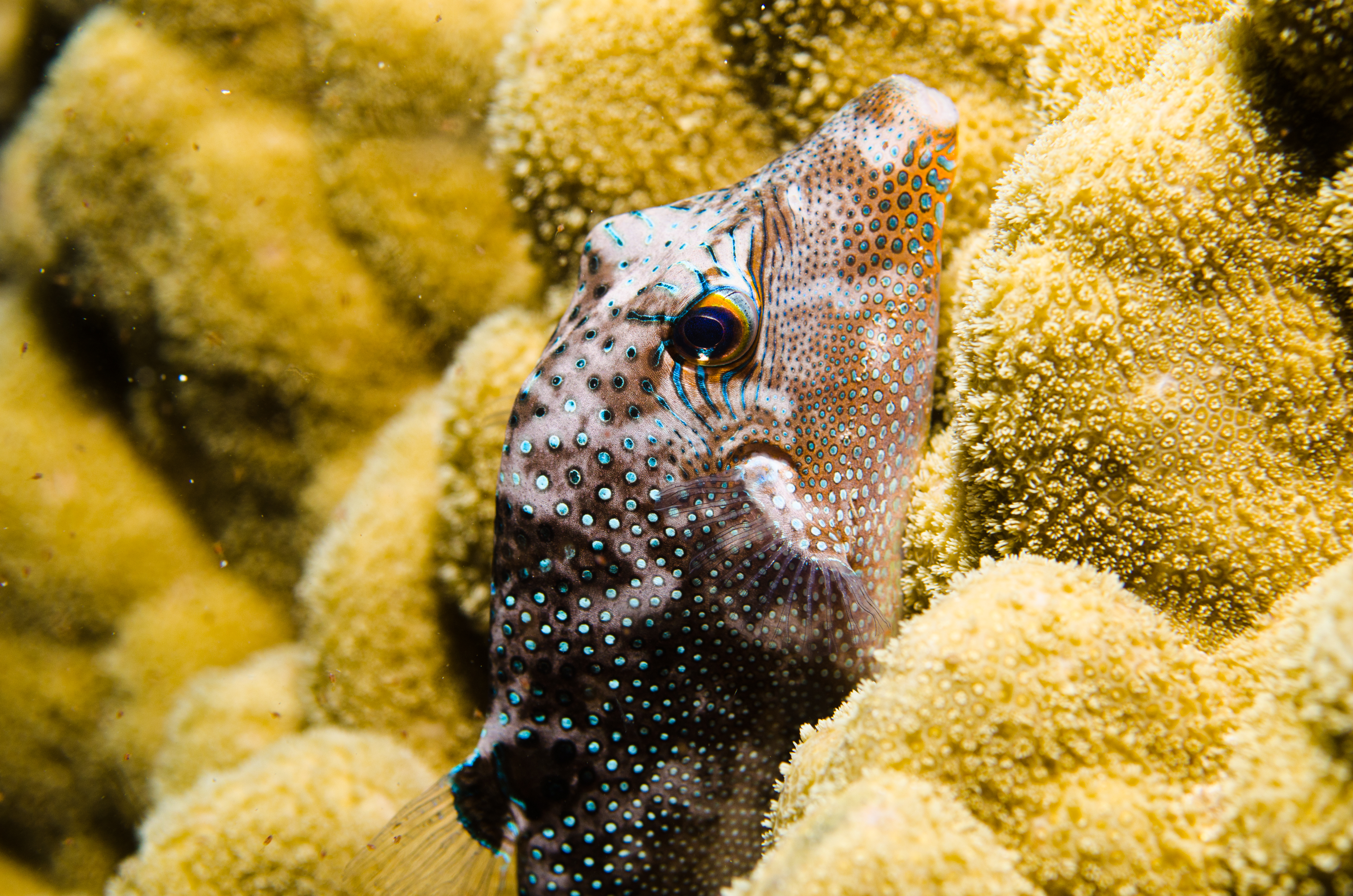 A tiny puffer fish (~2 in or 5 cm length) snuggles up to a Porties massive coral as I take his/her headshot
