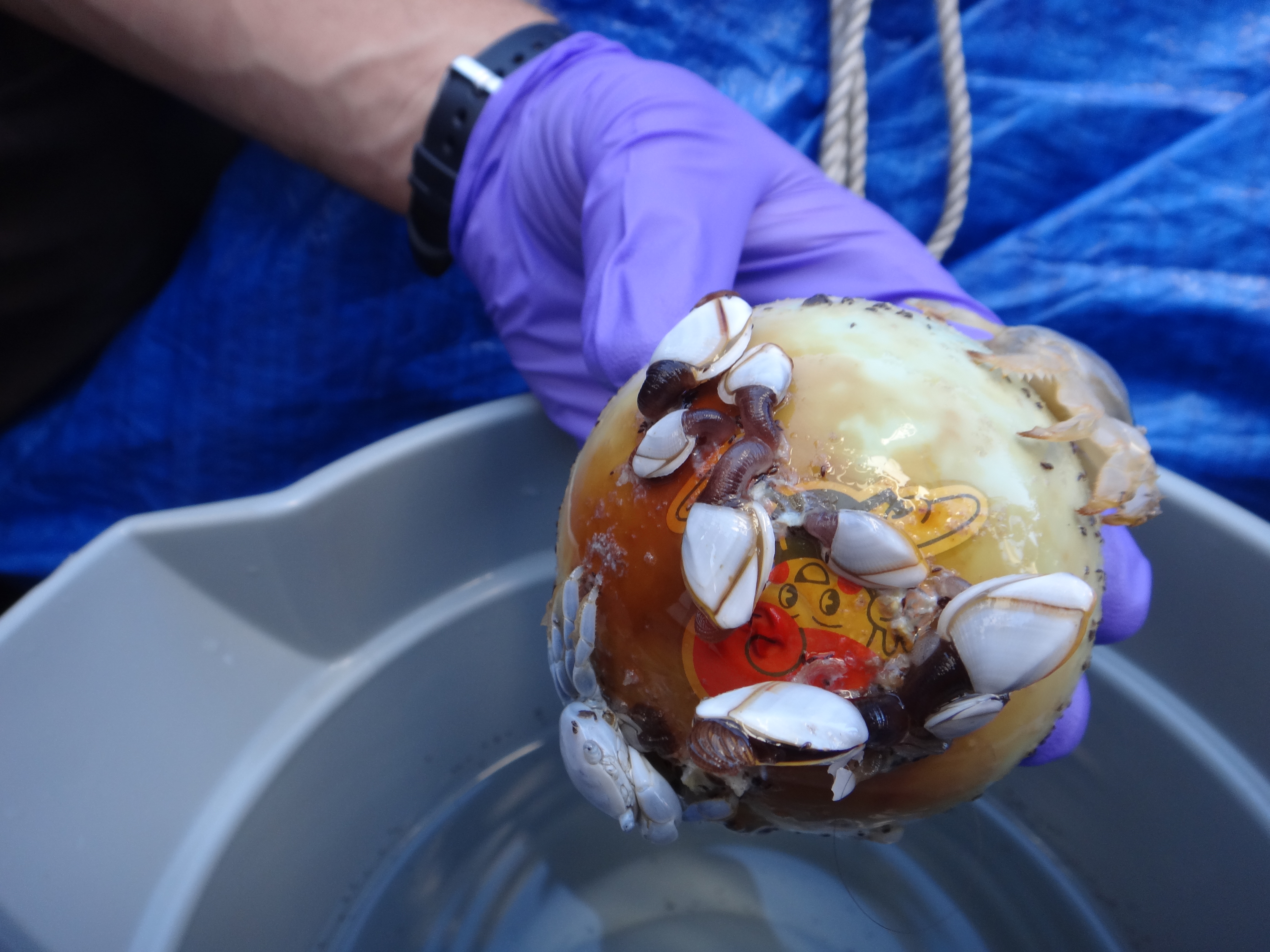 Tyson, Laura and I examine a Japanese fishing buoy that was covered in a whole slew of critters from thousands of barnacles and hundreds of crabs to giant isopods and polycheate worms. Shocking how much life can occupy so small an object! Photo by Marina Garland